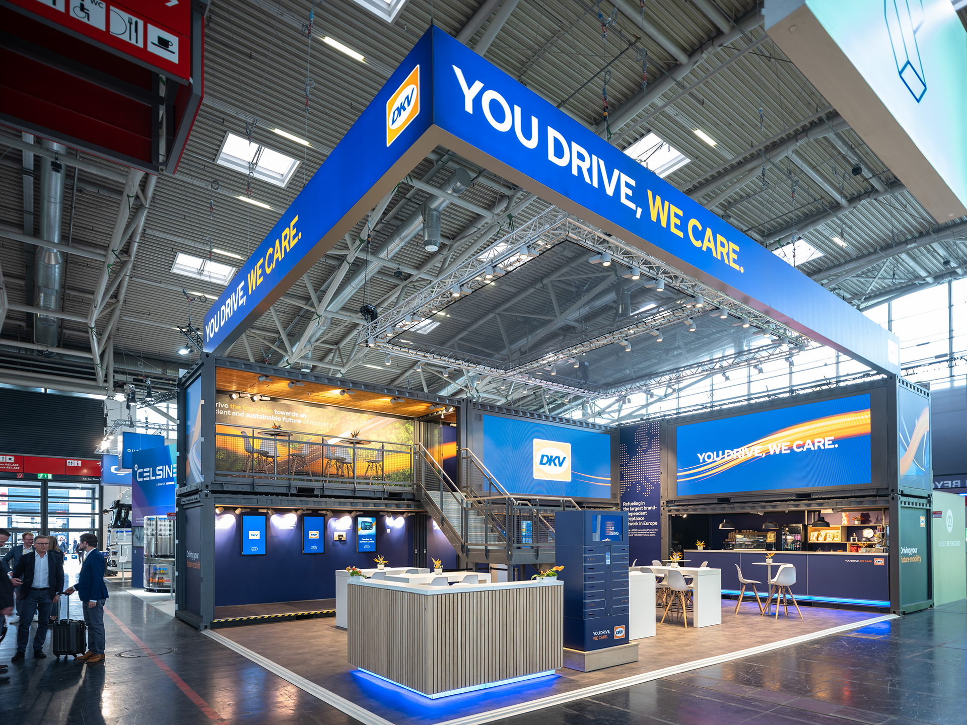 DKV Mobility präsentierte auf der Transport Logistic 2023 in München Paymentlösungen für nachhaltiges Fuhrparkmanagement. Der 150 m² große Messestand bestand aus umgebauten Schiffscontainern auf zwei Etagen – ein Statement für Kreislaufwirtschaft in der Logistikbranche. Die Container-Architektur von DAS SCHWARZE SCHAF® war vollständig wieder verwendbar, vermied mehrere Tonnen Messebau-Abfall und diente gleichzeitig als funktionale Präsentationsfläche. Besucher erlebten DKVs digitale Tankkarten, Mautlösungen und CO2-Tracking-Tools in einem Stand, der Transportkultur authentisch inszenierte.